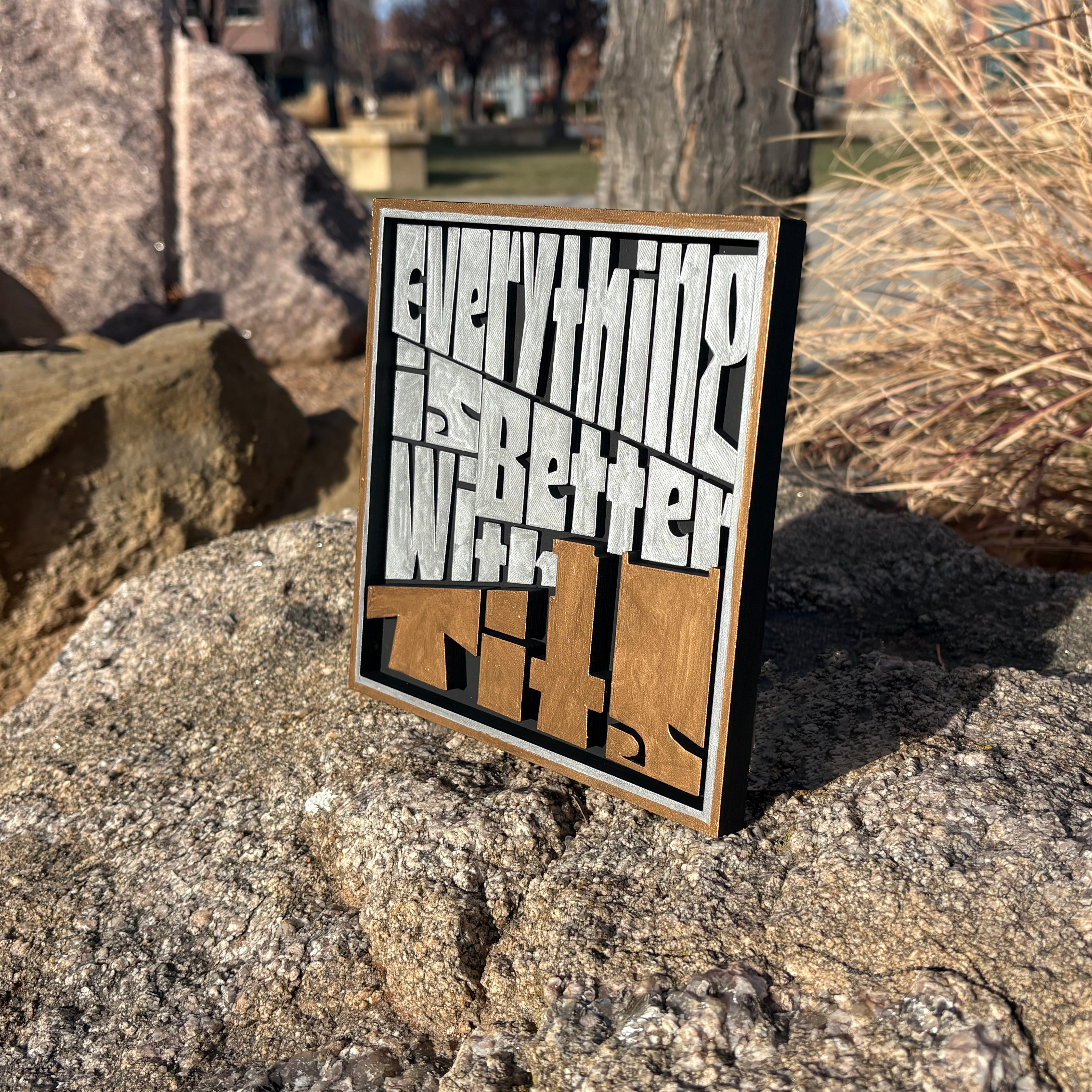 I choose the quote “Everything is Better with Tits” because everything is truly better with tits. Small tits, large tits, no tits, many tits, you name it. I came up with this quote after an amazing classmate named Callie showed her monster in our sketchbook class. It was a snowman with tits and it was beautiful. And so, a quote was born from it.